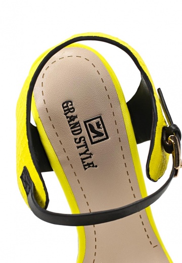 Эффектные босоножки от Grand Style черного цвета. Верх модели создан из комбинации натуральной и искусственной кожи. Детали: внутренняя отделка из искусственной и натуральной кожи, высокая устойчивая танкетка компенсируется платформой, ярко-желтые вставки.