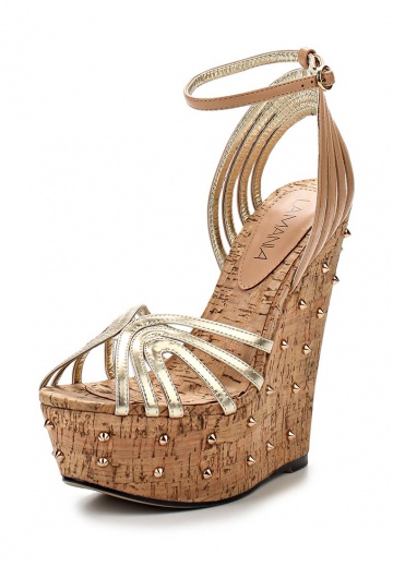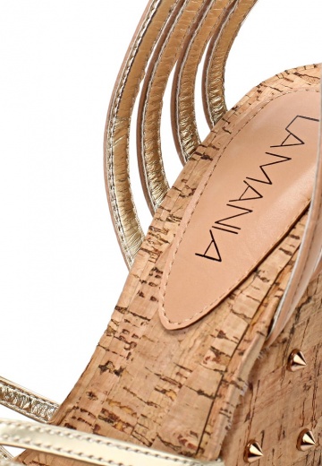 Стильные босоножки Lamania выполнены из искусственной кожи бежевого и золотистого цветов. Детали: ремешок на щиколотке, танкетка с пробковой фактурой декорирована золотистыми шипами.