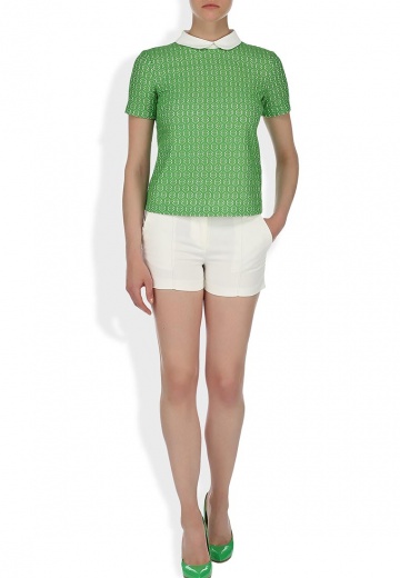 Стильная блуза Incity выполнена из плотного хлопкового материала зеленого цвета с кружевной фактурой. Детали: прямой крой, белый отложной воротник, сзади застежка на пуговицу.